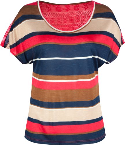 Full Tilt , Full Tilt knit top. Multicolored horizontal stripes with allover slub effect. Sheer front. Seethrough lace crochet open back. Scoop neck. Short dolman sleeves. 100% rayon. Machine wash. Imported.