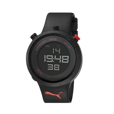 Puma , Sport watch, Digital quartz movement, Negative (light-on-dark) numbers, Dual time function, 1/100-second digital chronograph with available 10-lap memory measures split time, Lap data function, Countdown timer, Alarm mode, EL backlight, Digital black dial, Ventilated matte black polyurethane strap with embossed red logo and brushed black stainless steel buckle, Matte black plastic round case, Matte black/red plastic selector buttons, Acrylic lens, 50 meters/165 feet water resistant