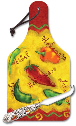 CounterArt Spicy Chili, Perfect for entertaining, this 'Big Cheese' cheese serving set from CounterArt features a sturdy tempered glass body that is hygienic and shatter-resistant. The colorful, artistic design will bring a distinctive style to your wine and cheese service at your next gathering. A two-pronged cheese knife with grape motif handle is included and a leather cord is tied at the top for hanging on the wall. Non-skid feet on the bottom of this piece will hold the piece steady, and protect your countertop from scratches. Measures 14-1/4-inch by 7-1/2-inch. Dishwasher safe.